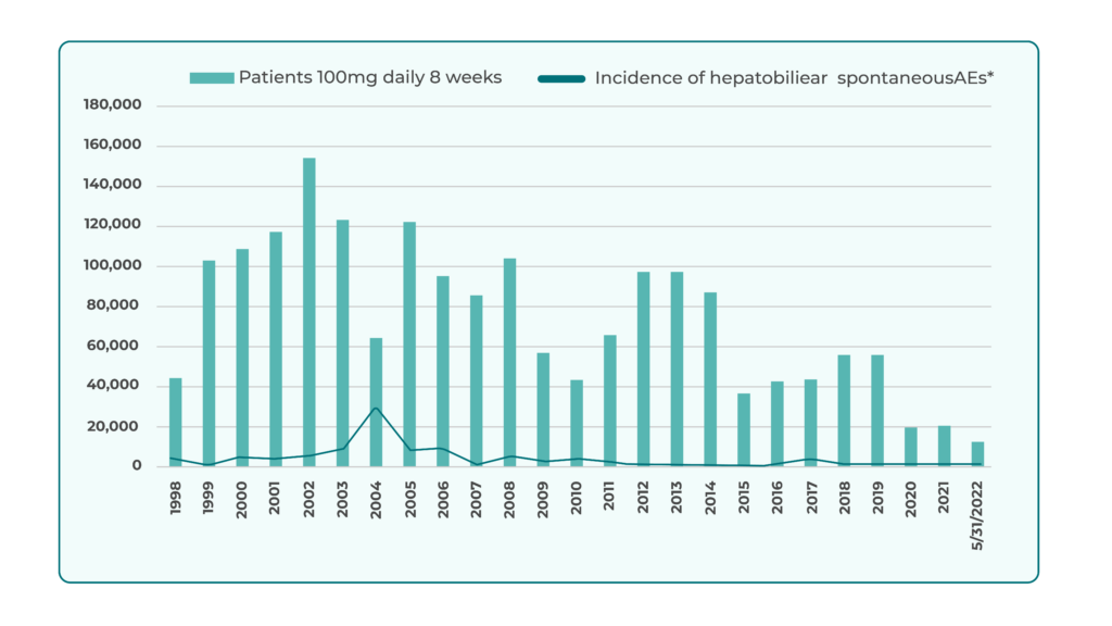 Global pharmacovigilance identified 49 spontaneous hepatobiliary cases over 24 years, corresponding to an incidence of ~1.06 cases per million 8-week treatment cycles (100 mg/day equivalent). Most showed mild, reversible liver biochemistry changes (<3 Ă— ULN).